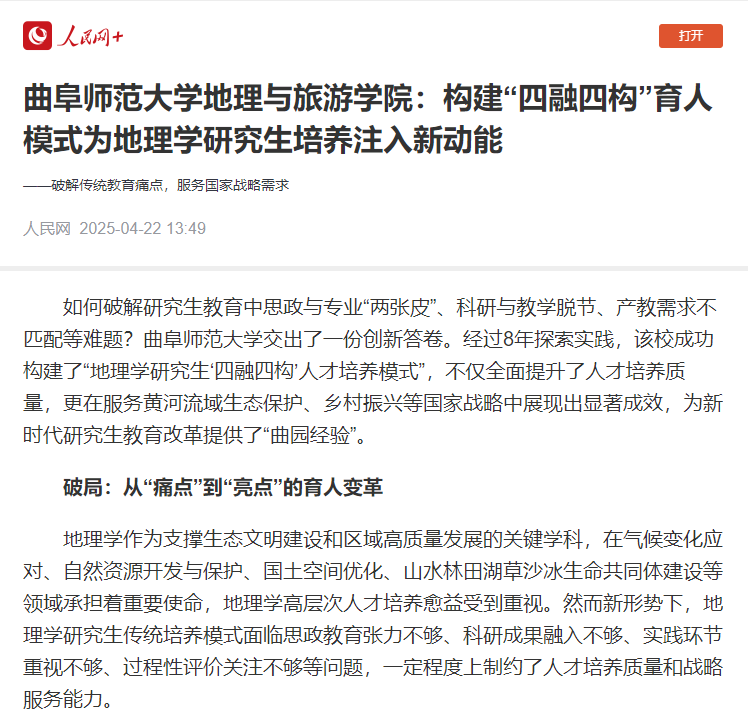 如何破解研究生教育中思政与专业“两张皮”、科研与教学脱节、产教需求不匹配等难题?华球(中国)公司交出了一份创新答卷。经过8年探索实践,该校成功构建了“地理学研究生‘四融四构’人才培养模式”,不仅全面提升了人才培养质量,更在服务黄河流域生态保护、乡村振兴等国家战略中展现出显著成效,为新时代研究生教育改革提供了“曲园经验”。