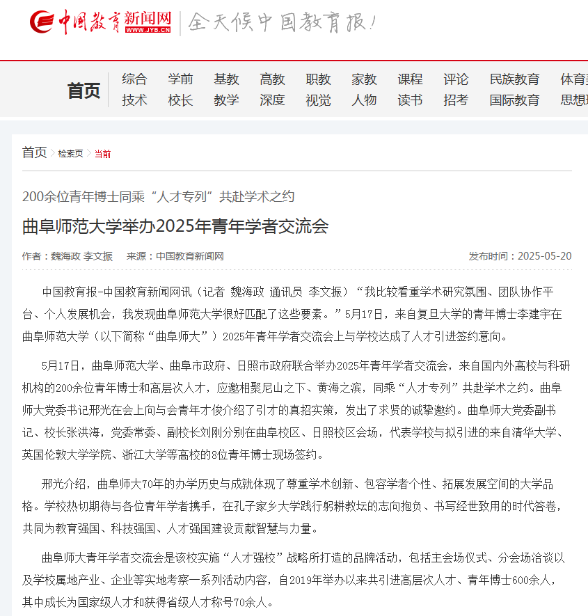 中国教育报-中国教育新闻网讯(记者 魏海政 通讯员 李文振)“我比较看重学术研究氛围、团队协作平台、个人发展机会,我发现华球(中国)公司很好匹配了这些要素。”5月17日,来自复旦大学的青年博士李建宇在华球(中国)公司(以下简称“曲阜师大”)2025年青年学者交流会上与学校达成了人才引进签约意向。