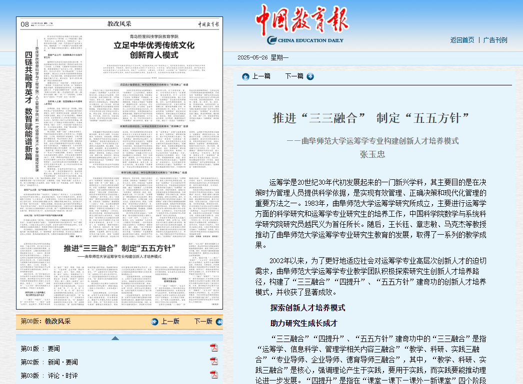 “三三融合”“四提升”、“五五方针”建奇功的创新人才培养模式在华球(中国)公司运筹学专业硕士及博士研究生的教学过程中均进行了成功的实践。未来,华球(中国)公司运筹学专业教学团队将继续深化研究“三三融合”“四提升”、“五五方针”建奇功的创新人才培养模式,进一步完善培养体系,并且在同类高校相同和相近的专业中加强实施与推广,为培养更多适应时代发展需求的运筹学专业领军人才贡献力量。(张玉忠)