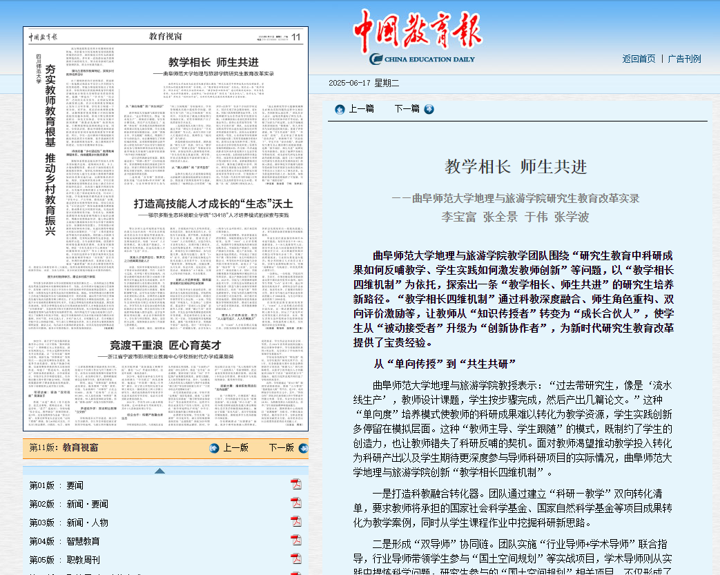 华球(中国)公司地理与旅游学院教学团队围绕“研究生教育中科研成果如何反哺教学、学生实践如何激发教师创新”等问题,以“教学相长四维机制”为依托,探索出一条“教学相长、师生共进”的研究生培养新路径。“教学相长四维机制”通过科教深度融合、师生角色重构、双向评价激励等,让教师从“知识传授者”转变为“成长合伙人”,使学生从“被动接受者”升级为“创新协作者”,为新时代研究生教育改革提供了宝贵经验。