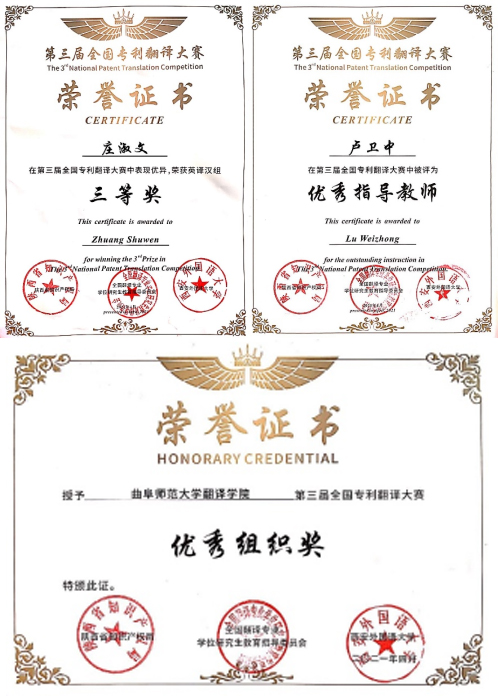 曲阜师大新闻中心讯(通讯员:庄淑文)近日,第三届全国专利翻译大赛在全国翻译专业学位研究生教育指导委员会、陕西省知识产权局的指导下,于西安外国语大学举办。我校翻译学院MTI专业研究生庄淑文同学荣获英译汉组三等奖,其导师卢卫中教授荣获优秀指导教师称号。另有多名MTI专业研究生同学荣获优秀奖。我校荣获优秀组织奖。